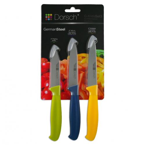 Praktisk startersæt med 3 knive. Dorsch har udviklet de skarpeste knive der er fremstillet i speciel rustfrit stål og med anti-bakteriel belægning, som forhindrer indtryk af bakterier på maden, når det skæres.